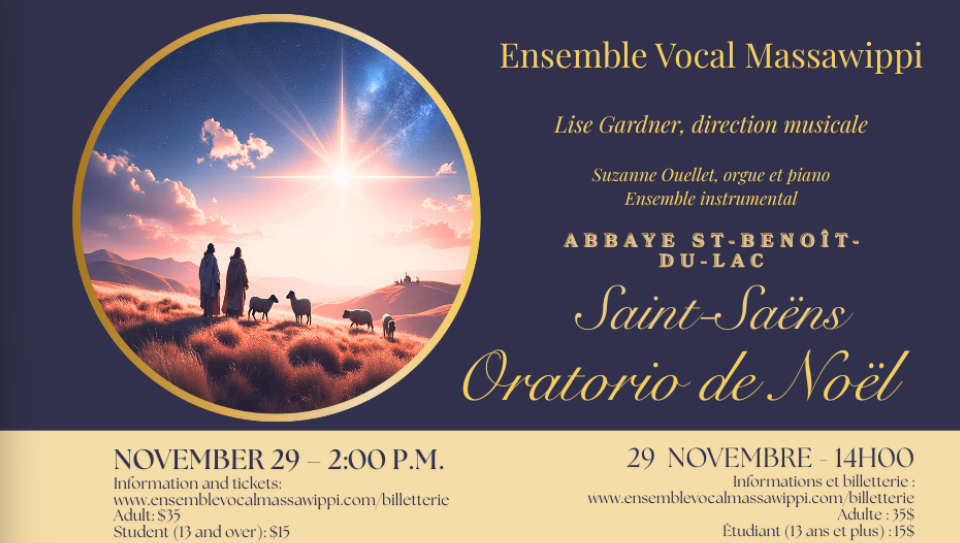 Pour ce moment de partage, l’Ensemble Vocal Massawippi aura la joie d’accueillir les jeunes choristes de l’école de la Montée et de l’école du Val-de-Grâce, qui se joindront à nous pour clore le concert dans un élan de splendeur, de joie et de paix.